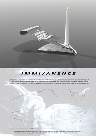 Adrian won the only award presented for 2D Design Silversmiths at the 2024 Goldsmith's Craft & Design Council Awards, a Bronze Award for his Immi/anence Candle Holder inspired by a silhouette of a antenatal ultrasound. (See image to the left)